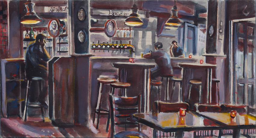 Peintures glanées dans les ‘bistrots Bruxellois’ dans lesquels Madeleine a passé des heures à observer, à envahir les tables avec ses tubes de couleurs et ses grands cartons, à l’affût d’un moment qui la touche…